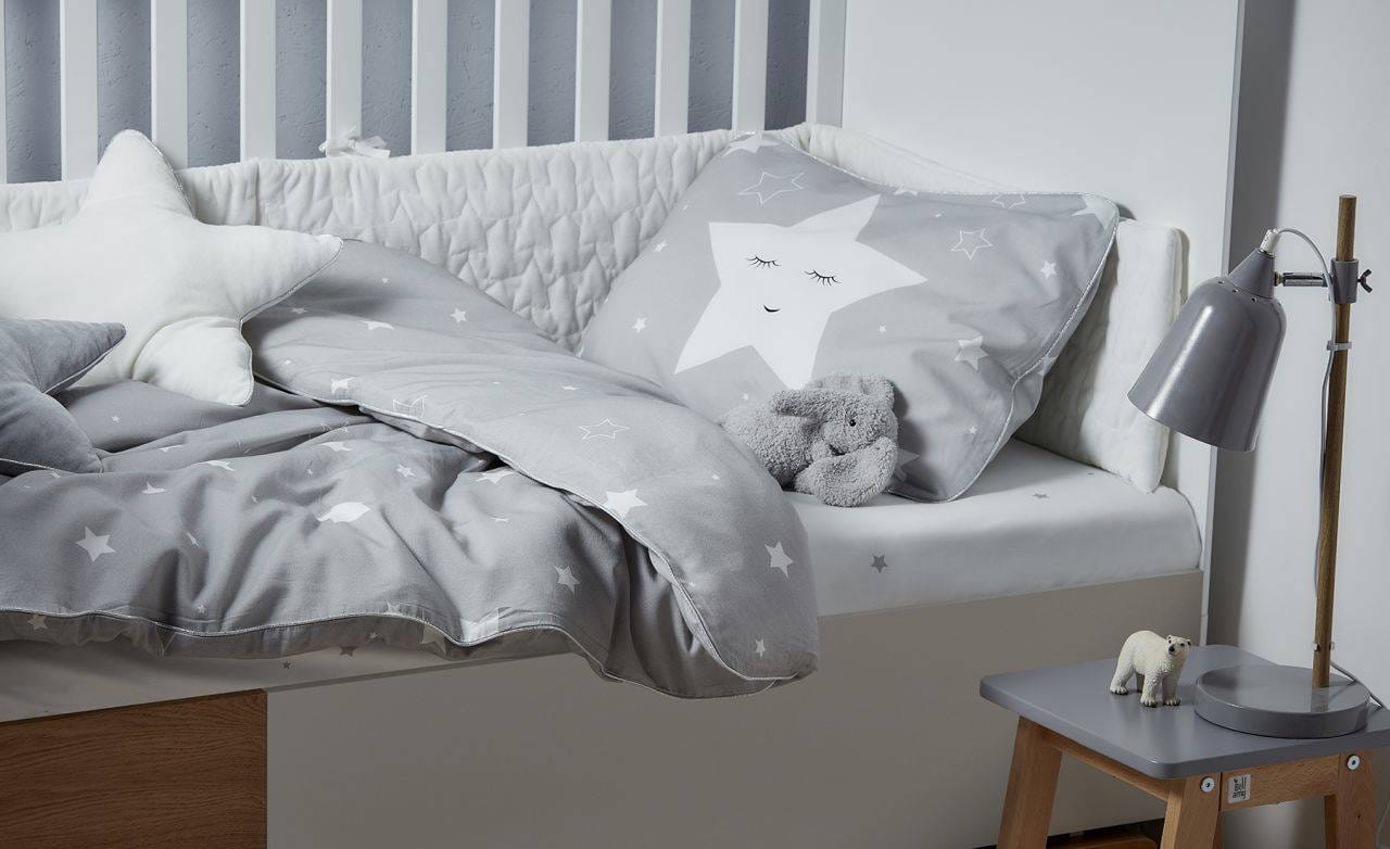 Prześcieradło na gumce z wysokogatunkowej bawełny w kolorze białym z motywem szarych gwiazdek.