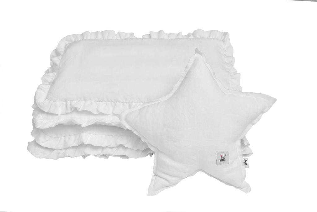 Kolekcję lnianą tworzą: pościele i prześcieradła w różnych rozmiarach, ochraniacz, ozdobna poduszka w kształcie gwiazdki, wałek pod głowę, baldachim, eleganckie falbanki do łóżeczka oraz przewijak z dwustronnym podkładem.