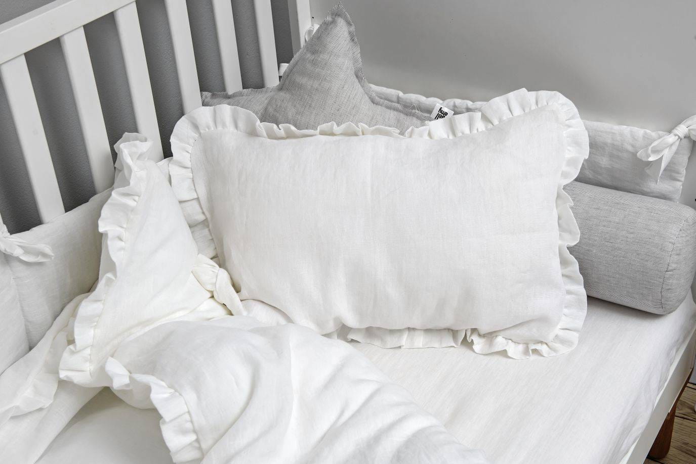 Kolekcję lnianą tworzą: pościele i prześcieradła w różnych rozmiarach, ochraniacz, ozdobna poduszka w kształcie gwiazdki, wałek pod głowę, baldachim, eleganckie falbanki do łóżeczka oraz przewijak z dwustronnym podkładem.