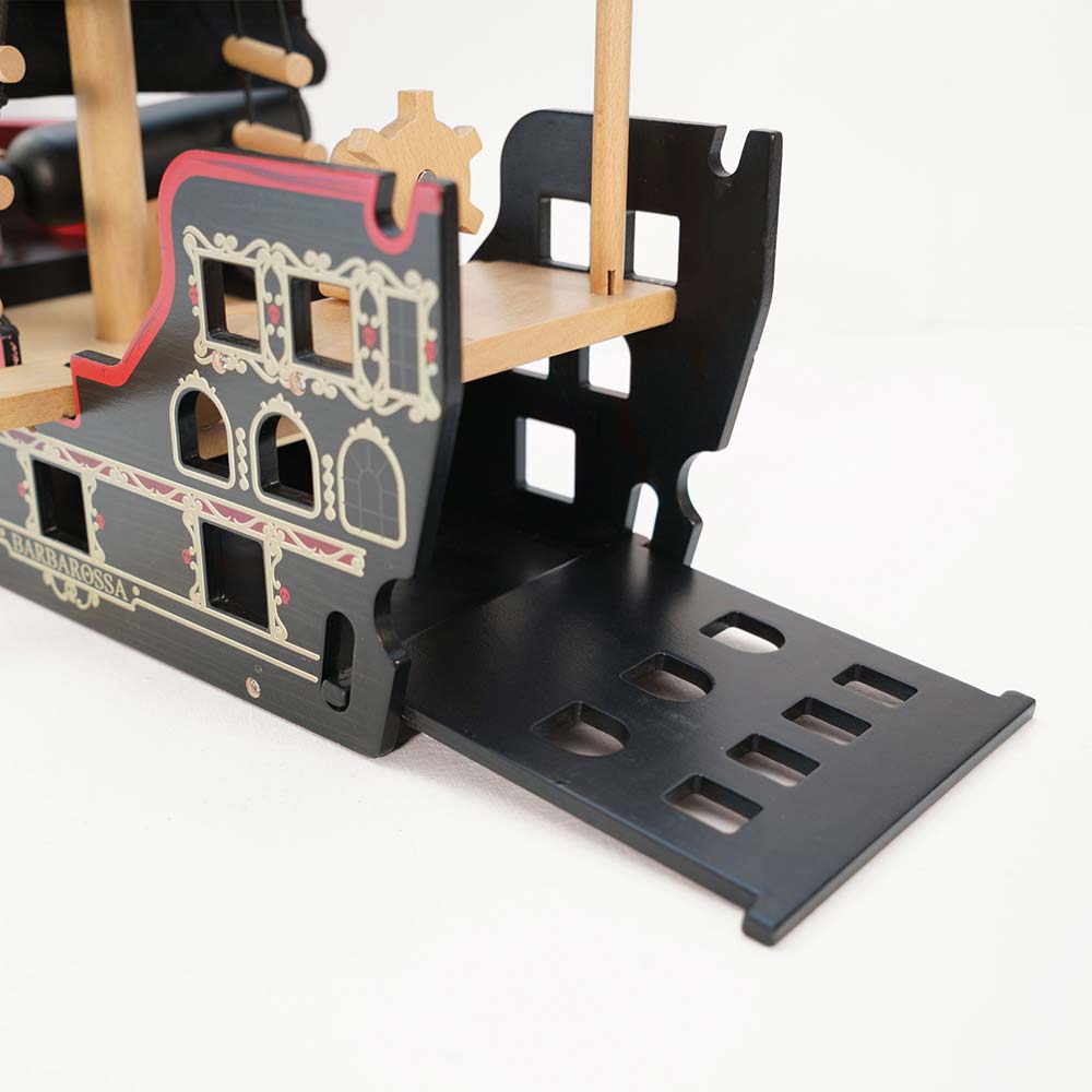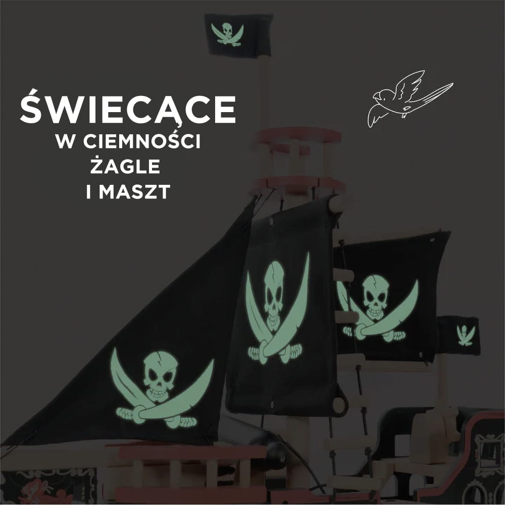 Wszyscy na pokład tego klasycznego, nagradzanego drewnianego statku zabawkowego, pomalowanego na mocny, czarny kolor, z falującymi żaglami i ozdobionego tradycyjnym motywem czaszki i skrzyżowanych mieczy dla autentycznego wyglądu.