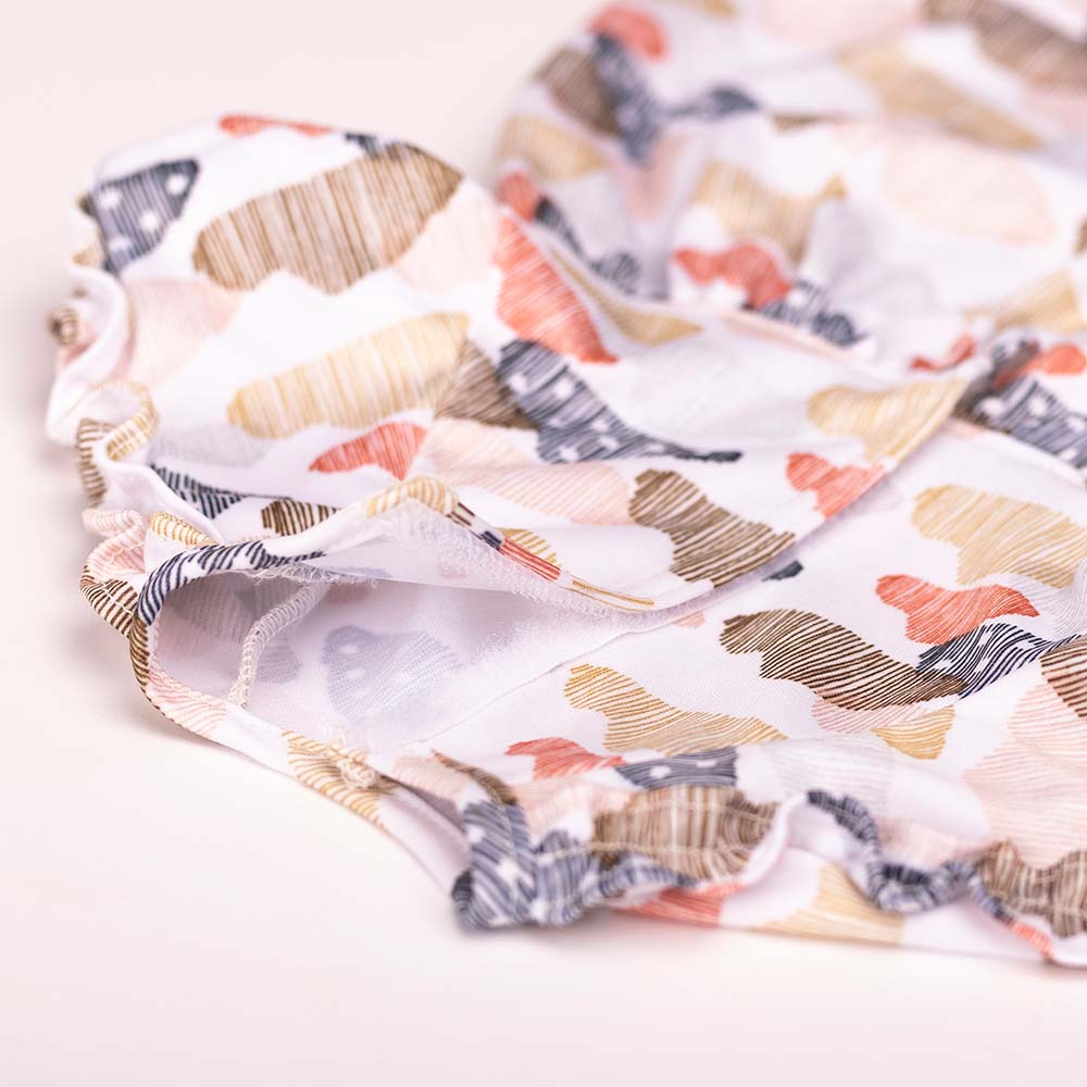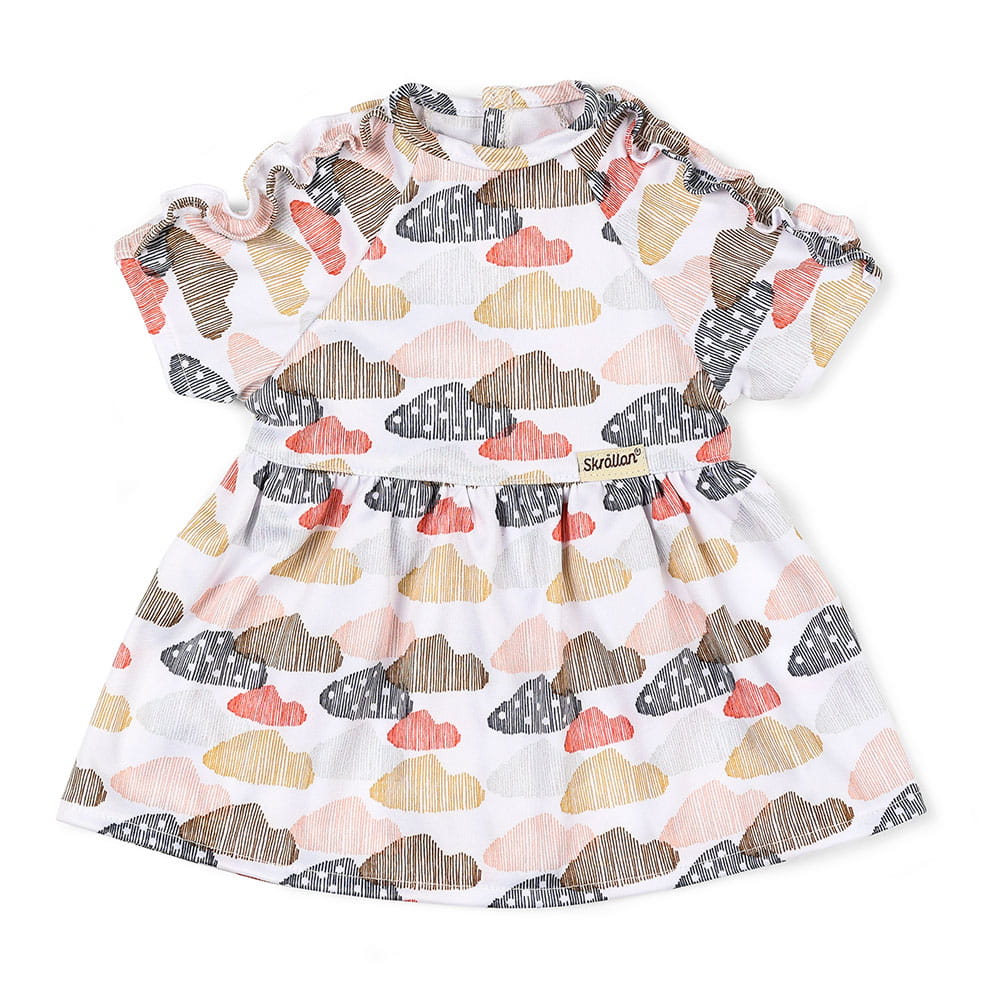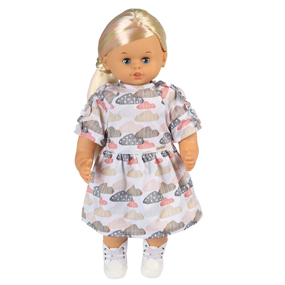 To jest ulubiona sukienka lalki, wykonana z miękkiego materiału dżersejowego z uroczymi detalami falbanek. Materiał ozdabiają kolorowe chmurki w różnych kolorach na białym tle. Ta sukienka ma zapięcie na rzep i można nosić ją zarówno na co dzień, jak i na uroczystości!