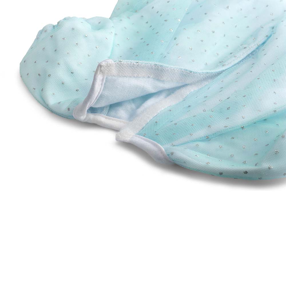 Błyszczący niebieski materiał oraz kokarda z gwiazdami przy szyi sprawiają, że Skrållan naprawdę wygląda pięknie na przyjęciu i szybko staje się ulubionym ubraniem w szafie.