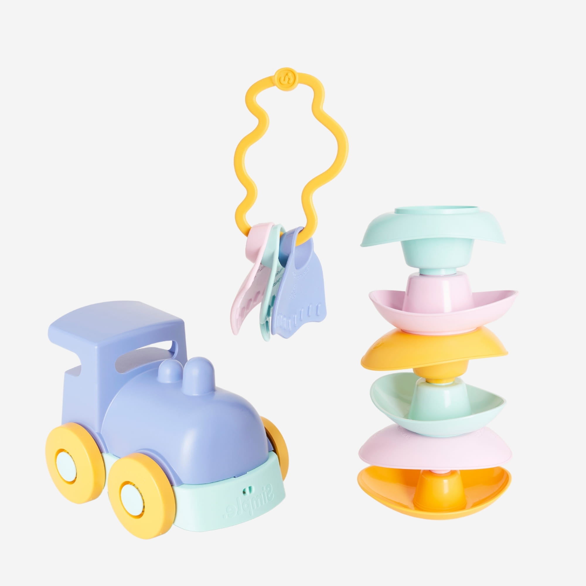 Zestaw trzech niezbędnych zabawek do wczesnego uczenia się: grzechotka/gryzak, układające się łódki i lokomotywa. Te trzy podstawowe zabawki do wczesnego uczenia się zachęcają do autonomii i rozwoju najmłodszych dzieci, towarzysząc im na co dzień. Idealny zestaw do towarzyszenia dzieciom w różnych etapach rozwoju.