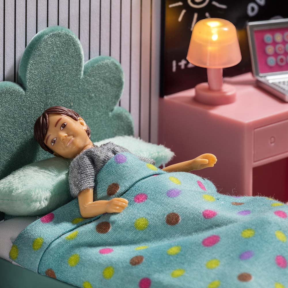Fajne łóżko, taboret i biurko dla nastolatka z rodziny Lundby. Na biurku jest komputer gotowy do gier lub rozmów z przyjaciółmi! Kiedy robi się ciemno, naturalnie włączasz małe lampki zasilane baterią, aby oświetlić swój domek dla lalek. Lampa wyłącza się automatycznie po 15 minutach. Łóżko ma tapicerowany zagłówek, szufladę na przechowywanie i miękką, przytulną kołdrę. Zestaw zawiera także miękką pufę i tablicę.