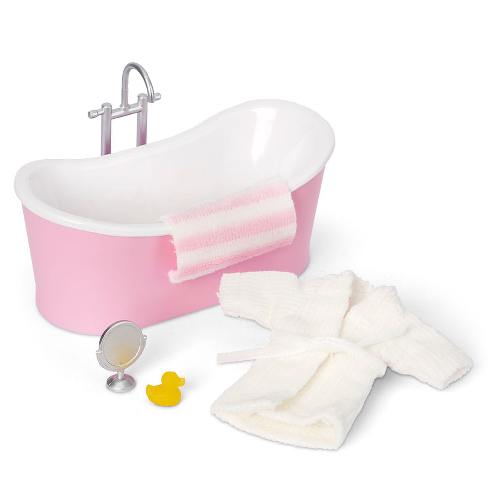 Oprócz wanny i szlafroka, zestaw łazienkowy ten zawiera także małe lustro i gumową kaczkę, która uwielbia pluskać się w wannie.