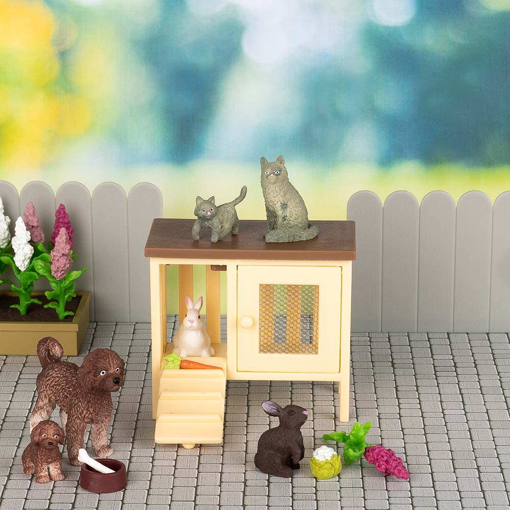 Zwierzęta domowe rodziny lalek uwielbiają bawić się i psocić. Dwa króliki, kot z kociakiem oraz pies ze szczeniakiem to oczywiście członkowie rodziny, którzy uwielbiają mieszkać razem w domku dla lalek. W zestawie znajduje się również klatka dla królików oraz miska z kością.